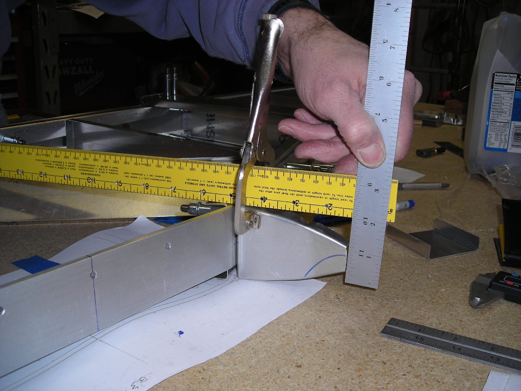 We had not attached the T06-06 Clip to the T06-03 Forward Spar Fitting. To locate those horizontally the plans show a dimension from the center of a mounting hole on the Forward Spar Fitting, a tricky measurement to make. We used a centerline mark on the Forward Spar Fitting out to the rib . Vertically we used a centerline and checked with the Leading Edge Rib.