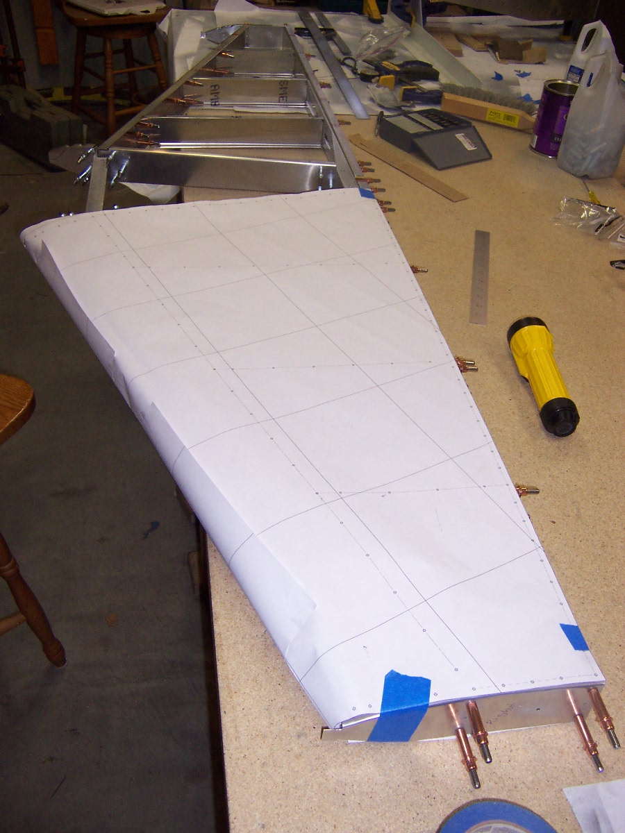 The date on thsi if between March and May 2011. We had created a CAD model of the horizonatal stab skin. The plotter has 36″ wide roll of paper and the part is begger than that. So we had to split the drawing and put alignment marks on them to mate them. If you read the Vertical Stab skin drawing entry, you know we were having trouble with the plotter accuracy over a few feet, and also the paper changes dimensions with humidity. We tried out best with the alignment and then wrapped the paper around the frame. With a light we could see where the skin holes were with respect to the center of the ribs. Some were excellent but towards the outboard side it was off a little.