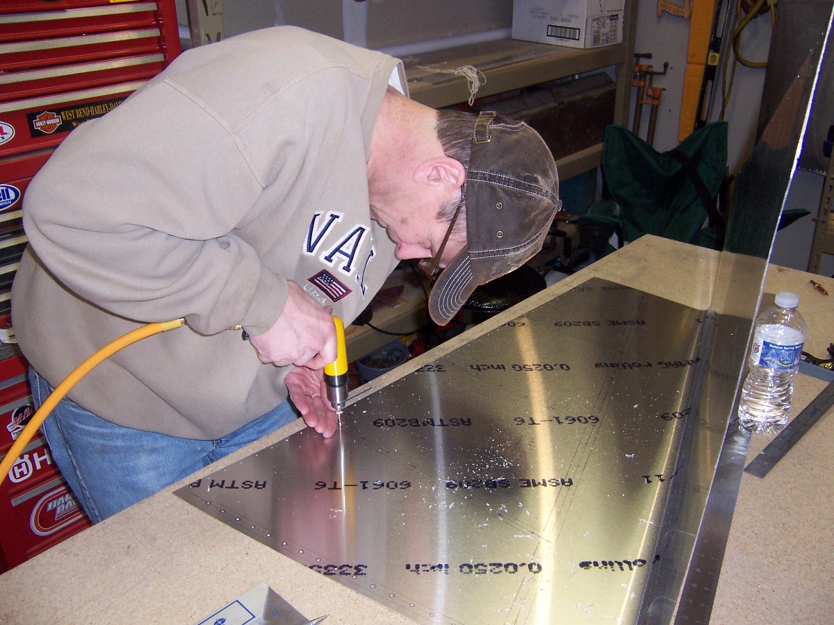 We cut a section of .025 for the rudder skin off a 4’x8′ sheet. The cut was full width (4′) and we scored it. We line up the score cut with the end of the table, place a 4′ straight edge underneath, clamp it down and push down on the other side of the score with a piece of 4′ steel angle. The two us were pushing pretty hard to get the sheet to break (we even flexed the scoring by rotating the sheet up and down). We need to find a better method, especially when we need a piece of .032, so we might try a router next. A variable speed at its slowest rpm might be the trick.