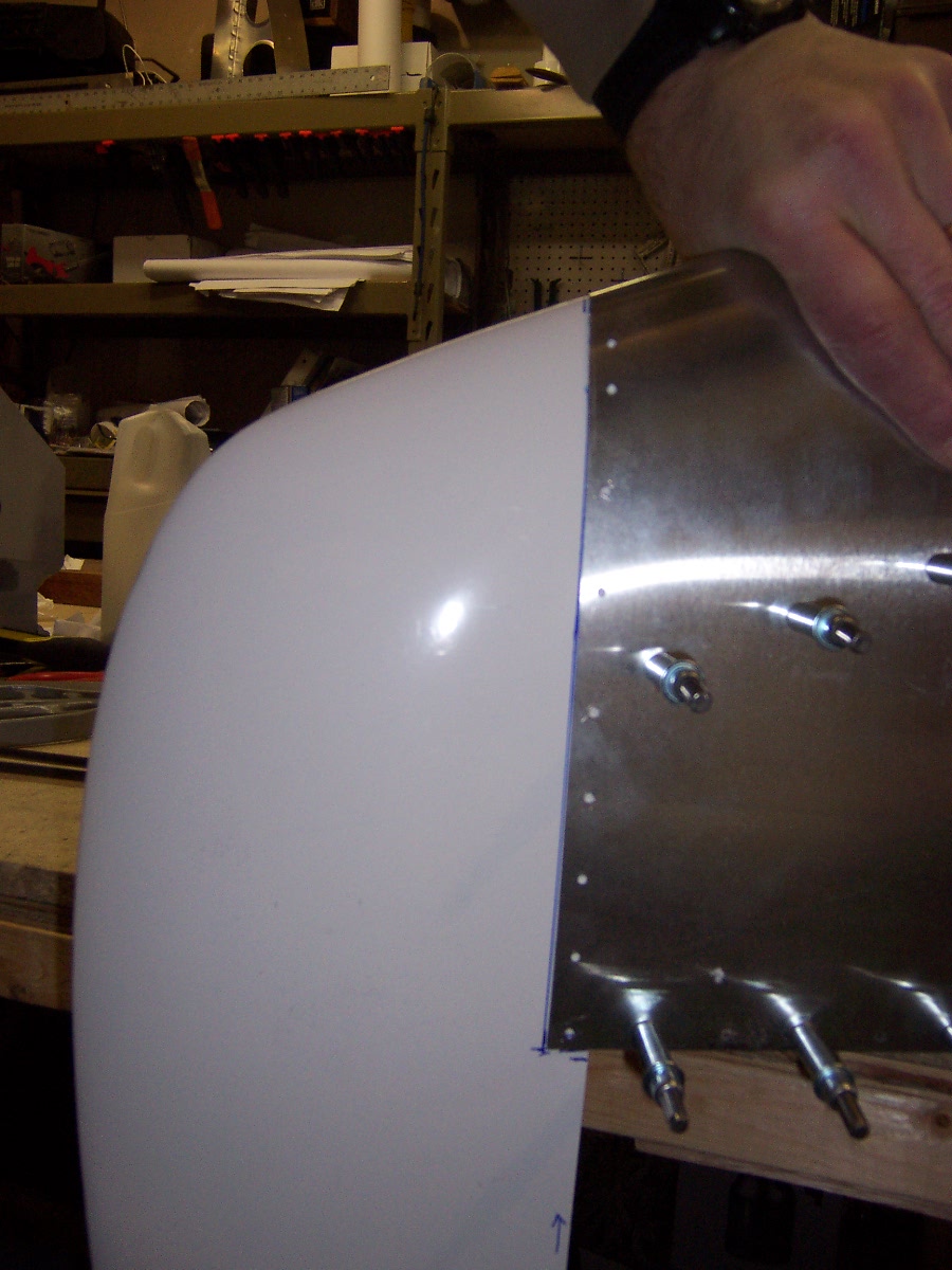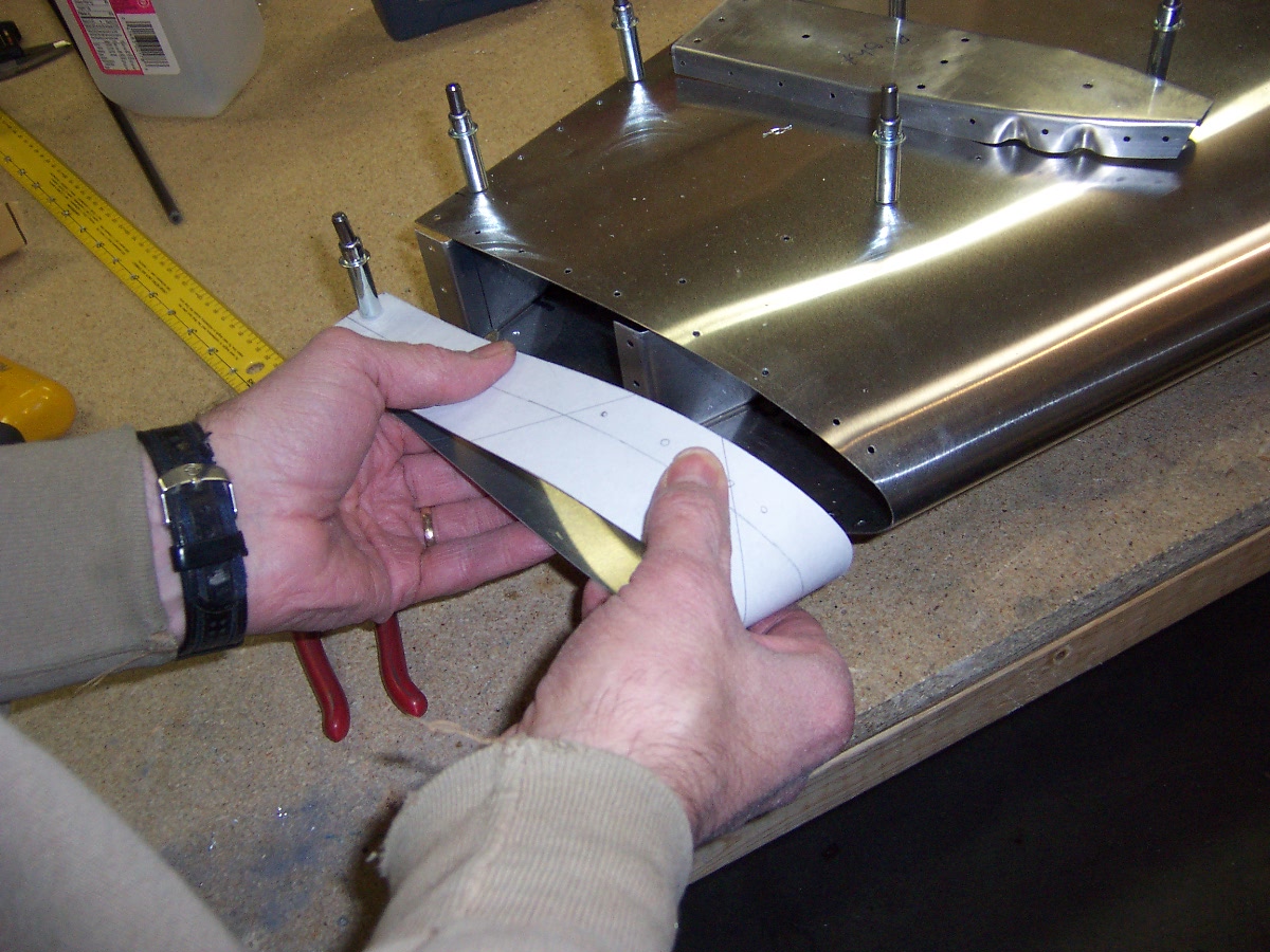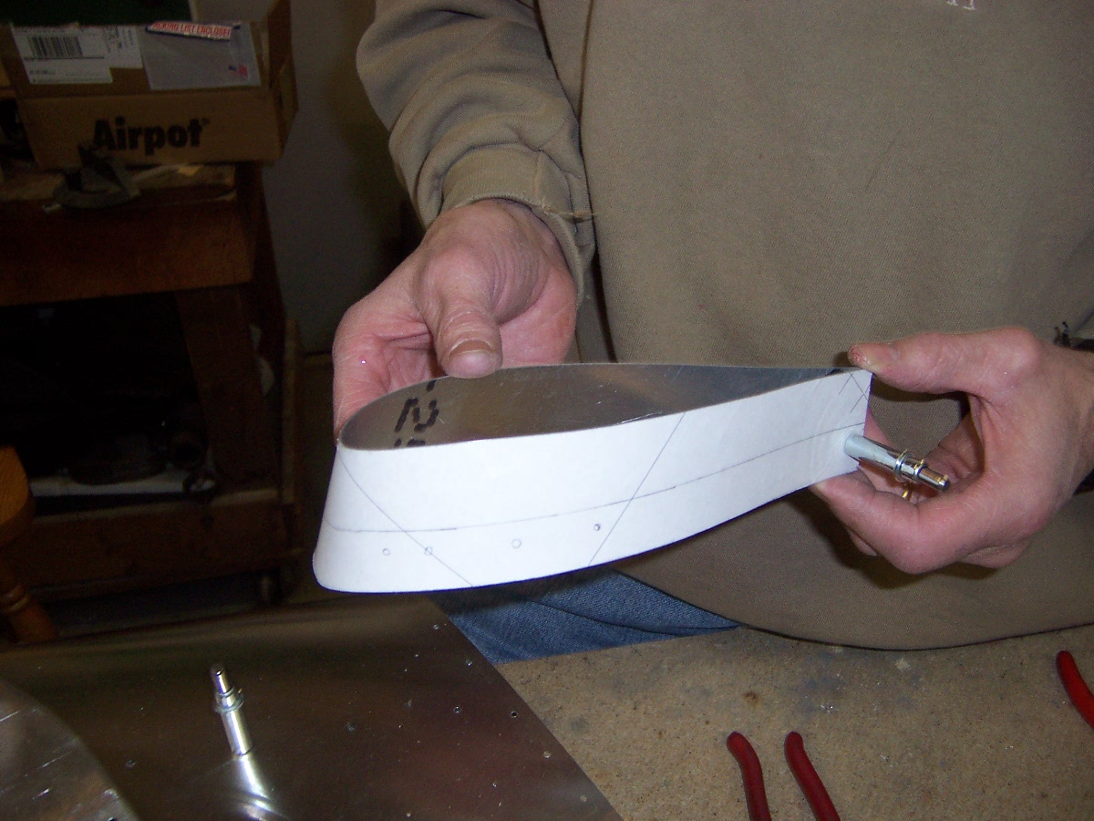 We used spray adhesive (3M 77, let it flash off a while before mating) to adhere the drawing to the sheet metal and snipped it out and filed it to the line. Dan measured and used the yard stick jole template to put the row of holes on each side. We then clecoed the tedges together (using those two rows) and to the table. We bent the leading edge using a piece of wood along the length.