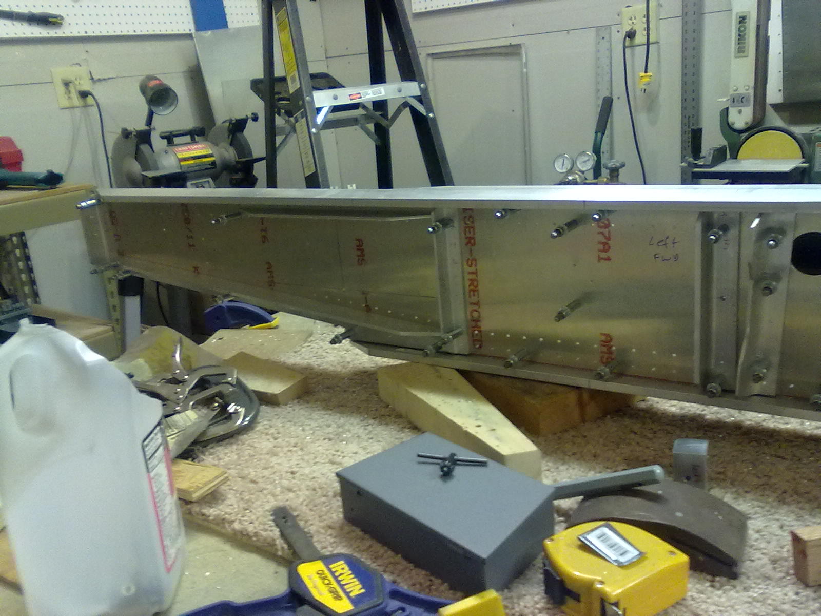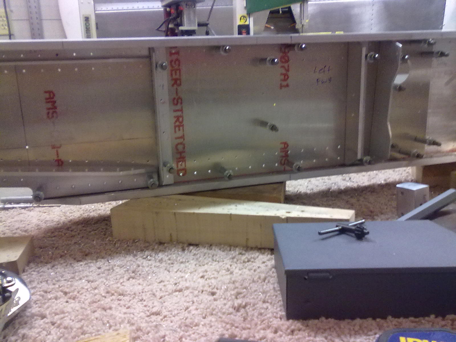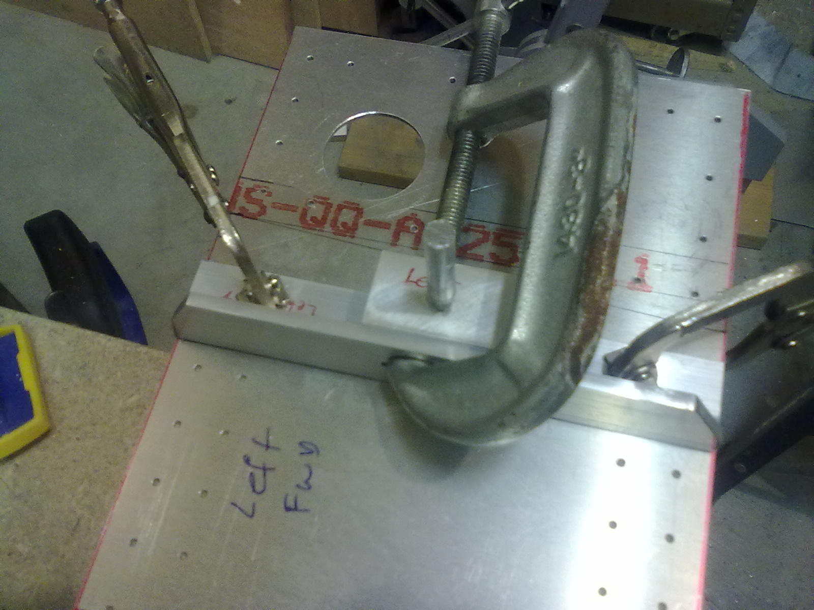 11/4/12 – Dan got in the garage and match drilled some of the spar assembly. To locate the spar spar attach block, Dan made a pin to fit in the 3/16 hole in the attach block. He also made a #40 hole in one end this pin. With a #40 drill bit in this end we can locate the attack block to the correct hole in the spar web.