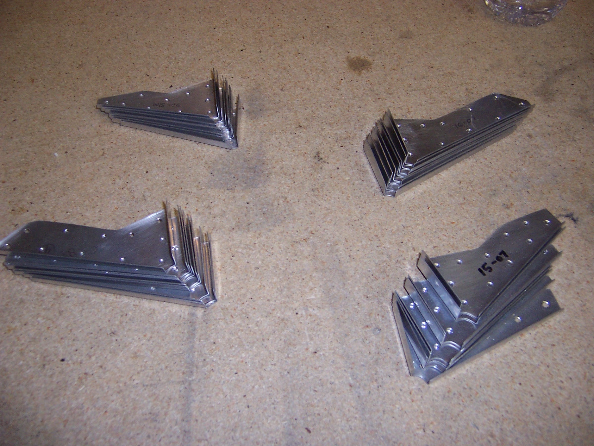 After cutting out the gussets had to clean them up. This includes filing and sanding all the edges smooth especially in the radius between to flange bends. This is a detail where one can be really picky since the radius should be tangent where it meets the straight edge of the flange. Here is a picture of the completed parts: