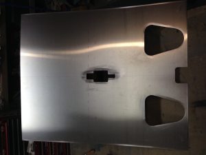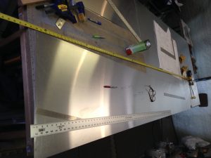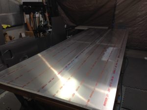 I finished the modified seat sling cut out tonight. I then moved the last full 4’x12′ sheet of 0.032″ sheet aluminum to the table to be cut into the lower side panels, F13-01, lower cockpit skin, F16-01, glare shield and control panel. We need to be sure we have a large enough piece for the control panel to add a few inches to the bottom as others builders have done for a little more instrument room.