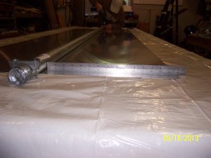 Dan cut out the top and bottom skins. Now it was time for the dreaded forward skin with the leading edge bend. The factory suggested a U shaped wooden channel and a guillitine type press that pivots on one end. Think of a paper cutter at the office. This seems kinda drastic but it must work. We had looked on the internet about the different ways people do this. Some have used the same wodden U channel but the center piece is actuated down level by two threaded rod jack screws. Finally there is the vacuum method that uses a pipe at the inside of the leading edge and you wrap the sink in some polymer sheeting and suck the air out with a shop vac. The pressure drop on the large sides of the skin pulls the metal in. There are several YouTube videos on this and we liked the result. So we tried it. The following pictures on the second side. We already had the experience of the first.